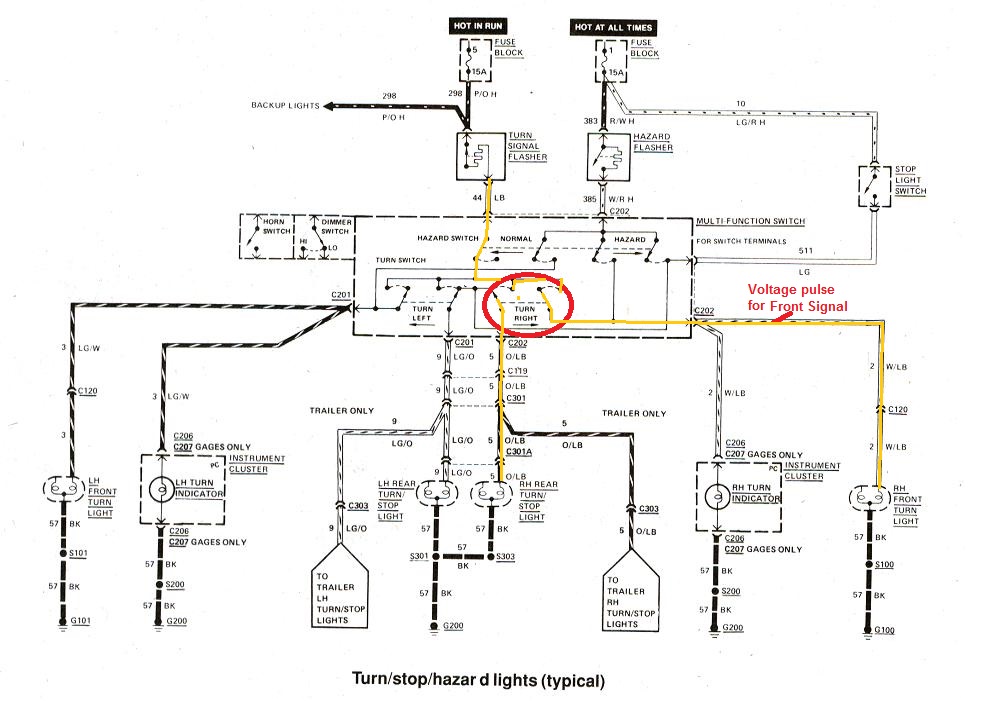 Take a look and I have highlighted the signal path through the multifunction switch. inside the multifunction switch that signal is sent to two different terminals. one terminal for the front lamp and a separate terminal to the rear lamp. This is a real simple circuit. Just start at the switch with your voltmeter and move down stream and check every plug and connection.