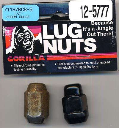 I usually spend my time and $$$ on my '87 Bronco II just keeping it rolling, but last week when I did the rear brakes I noticed the chrome lug nuts were badly rusted and looked like shXt. Although my old rusty B2 isn't exactly a looker, I spent a few bucks and ordered these black chrome (painted?) lug nuts. I think they look better than the silver chromed ones. I don't know if they'll hold up to snow, salt etc. any better than the regular chrome. They are part # 125777 at J C Whitney, 7.99 per pack of 5.